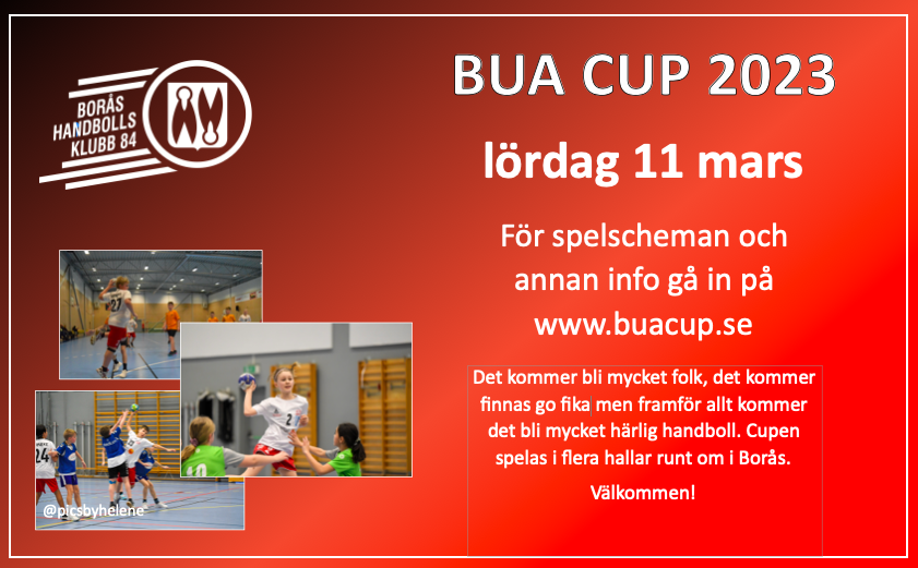 På lördag 11 mars genomför vi BUA CUP som är en handbollsturnering för ungdomar i åldern 10-13 år. 103 lag är anmälda och cupen spelas i flera hallar runt om i Borås. Det kommer bli mycket folk, det kommer bli trångt i hallarna men framför allt kommer det bli mycket härlig handboll. Välkommen! För spelscheman och annan info gå in på www.buacup.se Borås HK 84 10 mar 2023 0kommentarer