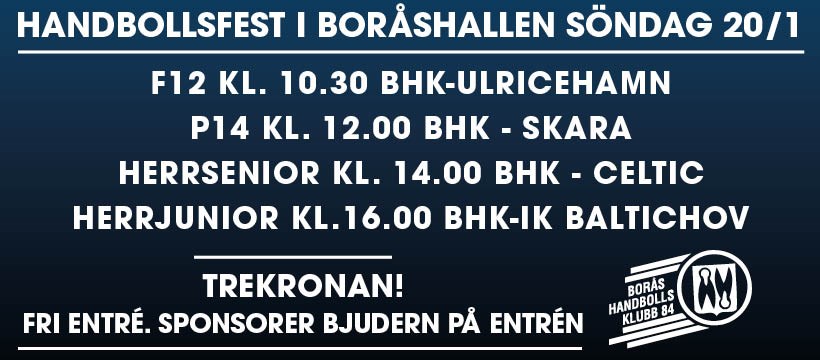 Söndag 20 januari har vi säsongens handbollsfest i Boråshallen. Fyra av våra lag spelar under dagen där det är fri entré hela arrangemanget. Värdefulla sponsorer betalar 3:- per åskådare så förutom att se den bästa sporten på plats så är du med och bidrar till Borås HK bara genom att närvara under dagen! Ta med syrran, farfar, kusiner, grannar och ALLA ni bara kan komma på och kom och titta på handboll i Boråshallen på söndag!